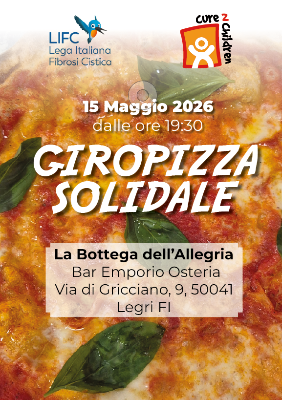 Una serata speciale all’insegna del gusto e della solidarietà! Partecipa al nostro giropizza e contribuisci a sostenere importanti realtà impegnate nella cura e nella ricerca: la Lega Italiana Fibrosi Cistica e Cure2Children. Con la tua presenza potrai trascorrere una serata piacevole in compagnia, gustando pizza senza limiti, e allo stesso tempo fare la differenza per chi ne ha davvero bisogno. 💛 Il ricavato sarà devoluto a sostegno dei progetti delle due associazioni. Prenota il tuo posto e unisciti a noi: insieme, anche una semplice cena può diventare qualcosa di grande.